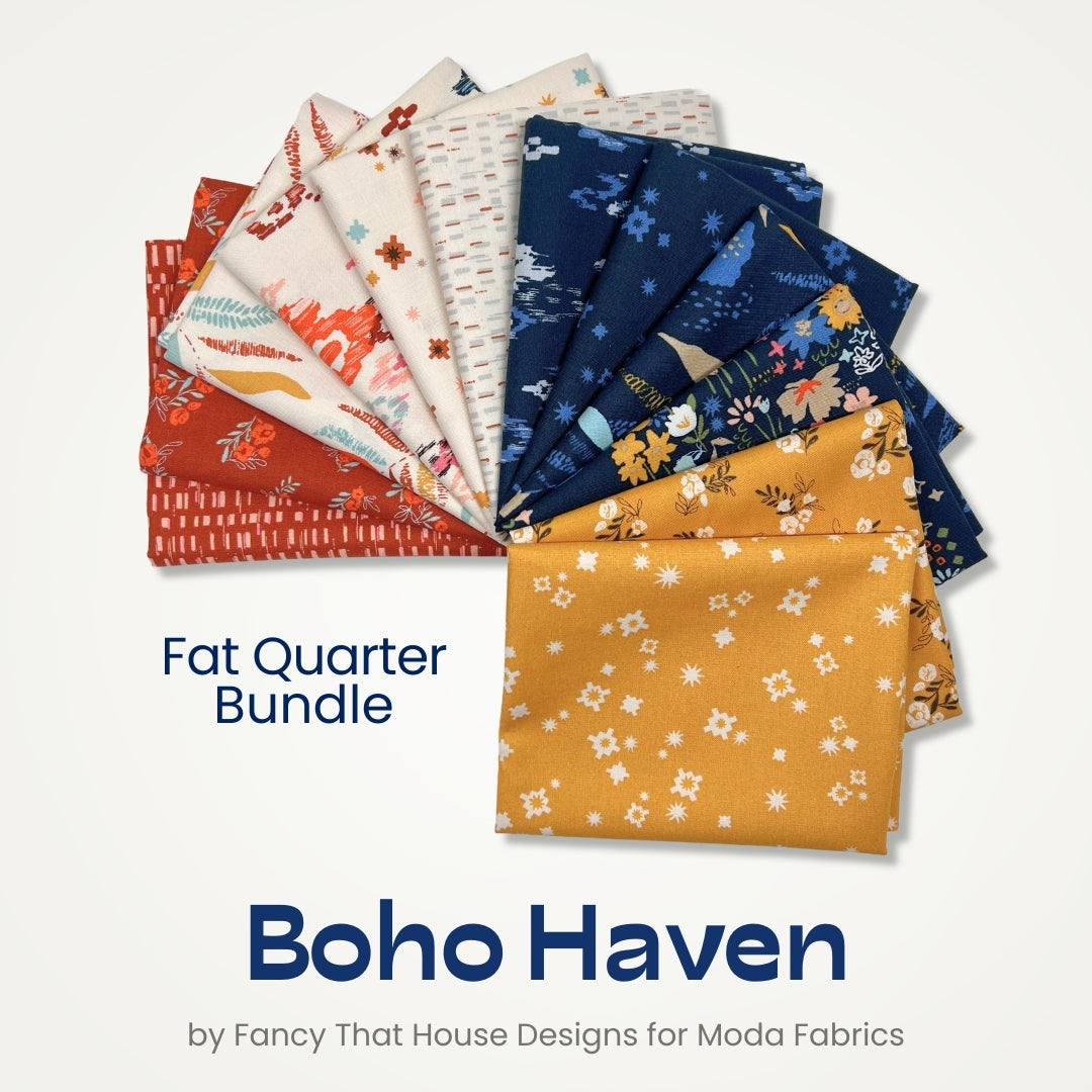 Warm, free-spirited, and effortlessly stylish, Boho Haven by Fancy That Design House for Moda Fabrics brings a relaxed, modern bohemian vibe to your sewing room. This 12-piece fat quarter bundle is filled with rich color and playful pattern, perfect for creating quilts with personality and movement.
