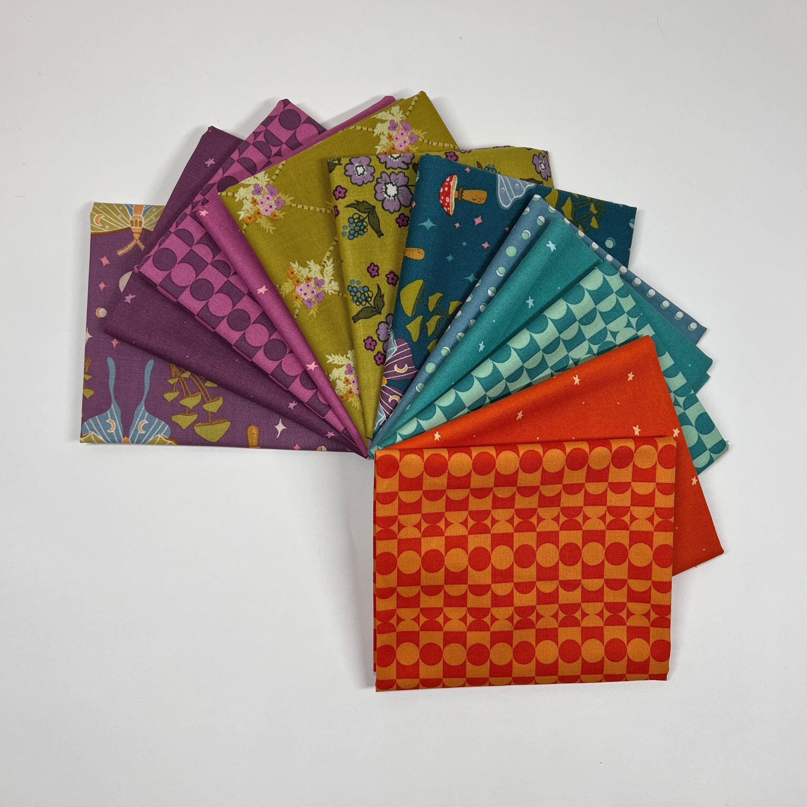 This striking 12-piece bundle combines bold modern geometry with whimsical florals and magical moth motifs, creating a collection that feels playful, artistic, and full of energy. With a rich palette of deep purples, bright oranges, teal blues, fresh greens, and soft pink accents, these fabrics are perfect for quilts that make a statement.