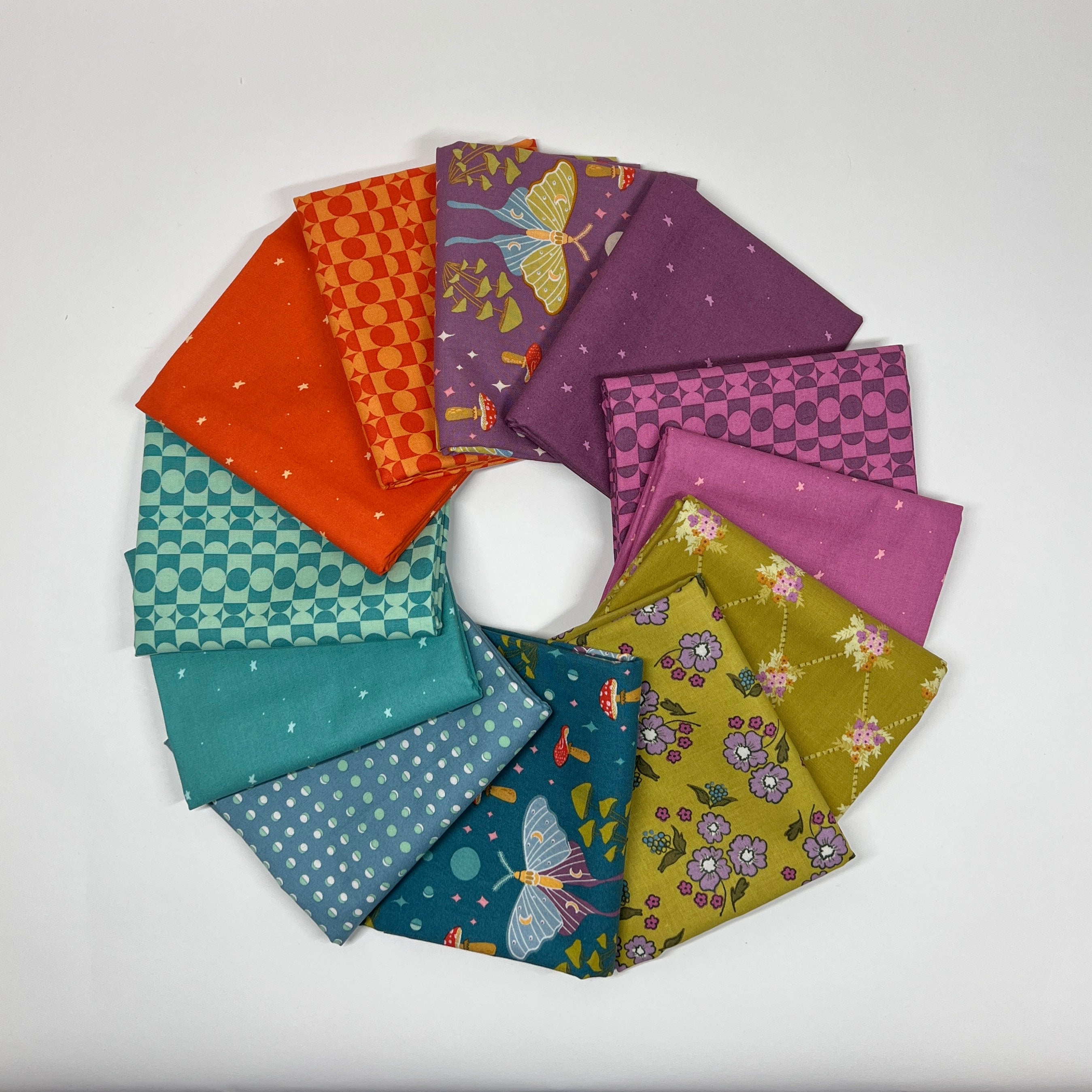 This striking 12-piece bundle combines bold modern geometry with whimsical florals and magical moth motifs, creating a collection that feels playful, artistic, and full of energy. With a rich palette of deep purples, bright oranges, teal blues, fresh greens, and soft pink accents, these fabrics are perfect for quilts that make a statement.