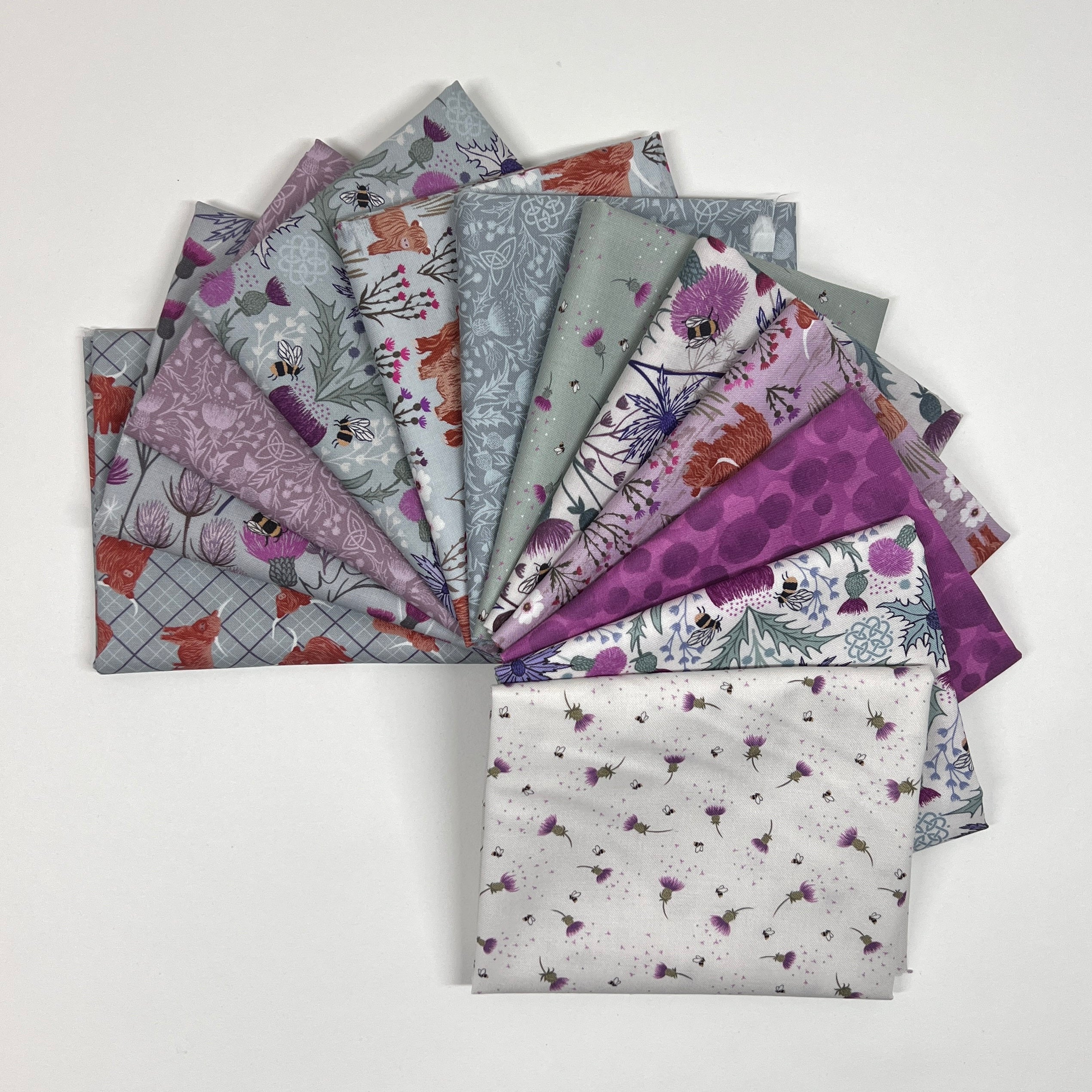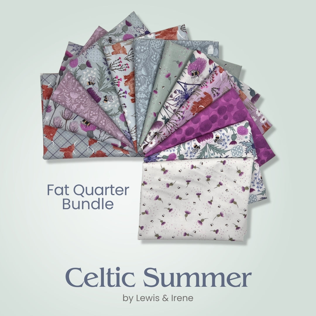 Celebrate the beauty of wild meadows and countryside charm with Celtic Summer by Lewis & Irene. This enchanting 12-piece fat quarter bundle captures the spirit of a blooming summer landscape with a fresh, romantic palette of soft sage, misty blue, creamy ivory, and rich thistle purples. Delicate florals and meadow botanicals are joined by the sweetest Highland cows, adding a touch of rustic Scottish charm and personality to this whimsical collection.