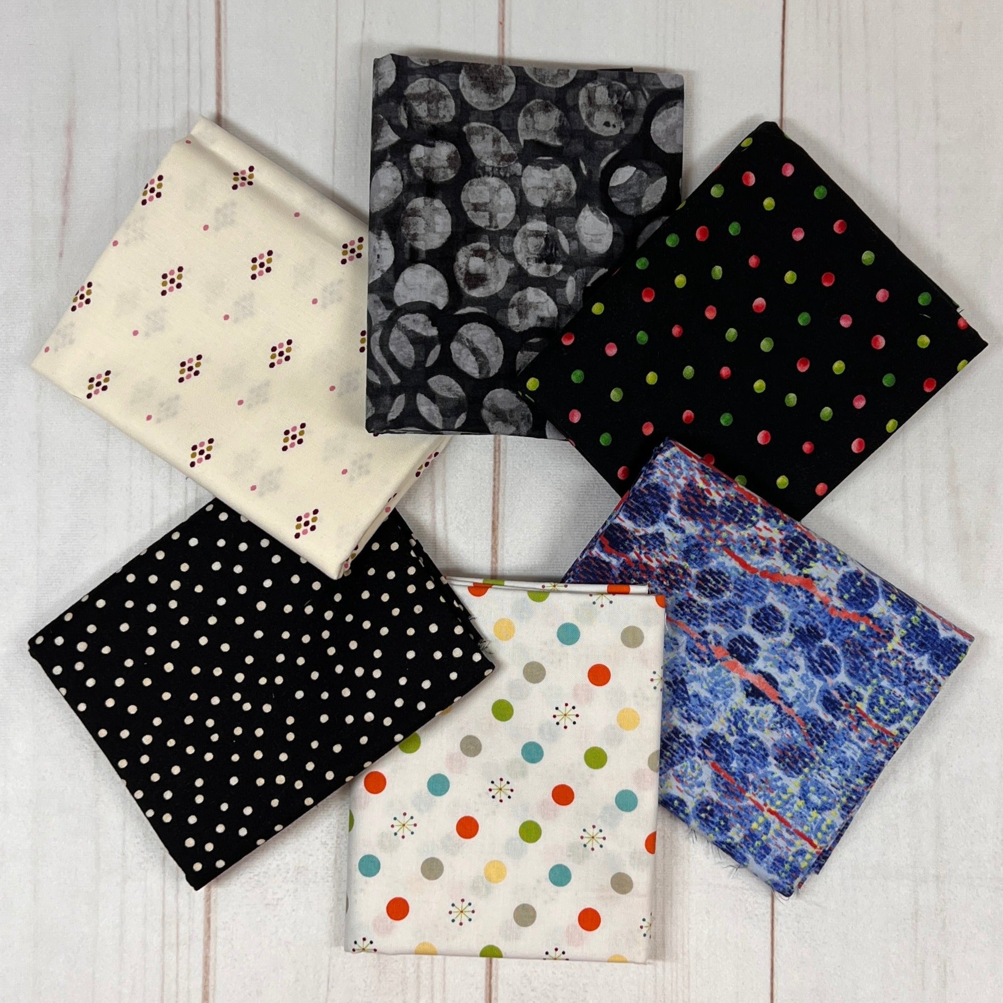 Six different 1/2 yard cuts of Dotted fabrics, but a total mystery as to what you will get. Still our great quilt shop quality fabrics, just leftovers from previous bundles. 3 yards total. Great Stash builder.