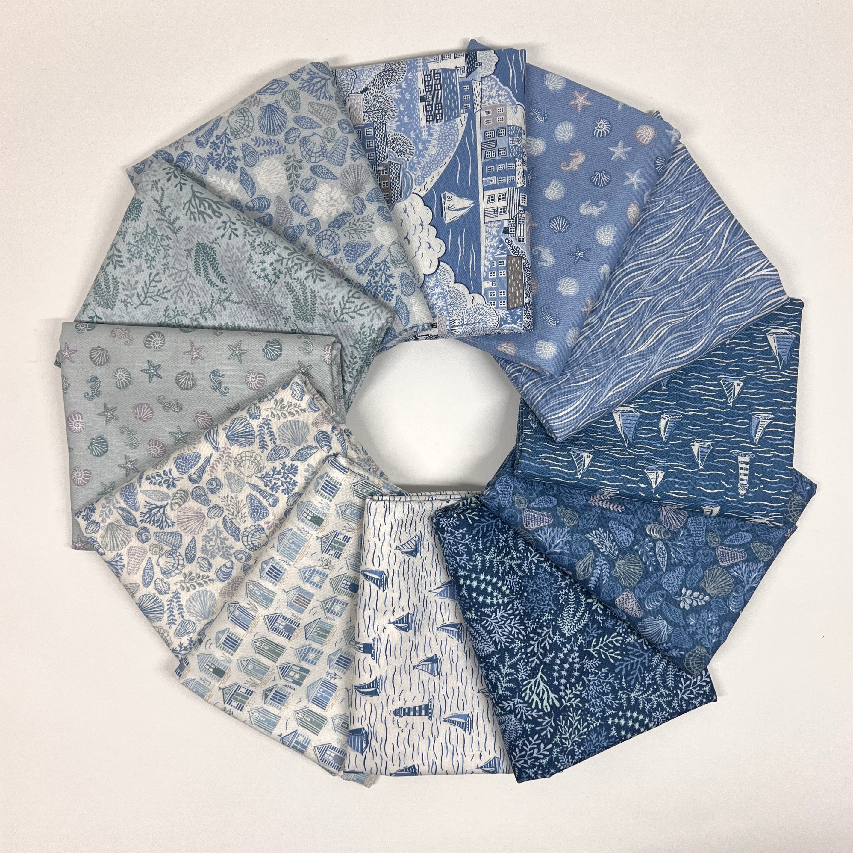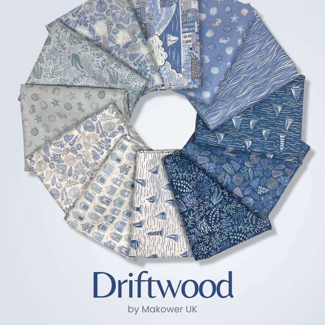 Soft coastal charm meets timeless blue-and-white elegance in Driftwood by Makower UK. Inspired by peaceful seaside villages and ocean treasures, this 12-piece half yard bundle captures the calming beauty of the shore.