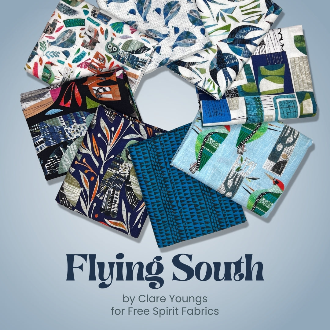 Bold, playful, and full of movement, Flying South by Clare Youngs for FreeSpirit Fabrics is a vibrant collection inspired by migration, nature, and the joy of exploration. This 8 piece half yard bundle features striking bird motifs, layered textures, and expressive botanical shapes in a rich palette of blues, teals, navy, crisp white, and lively pops of green and warm accents.