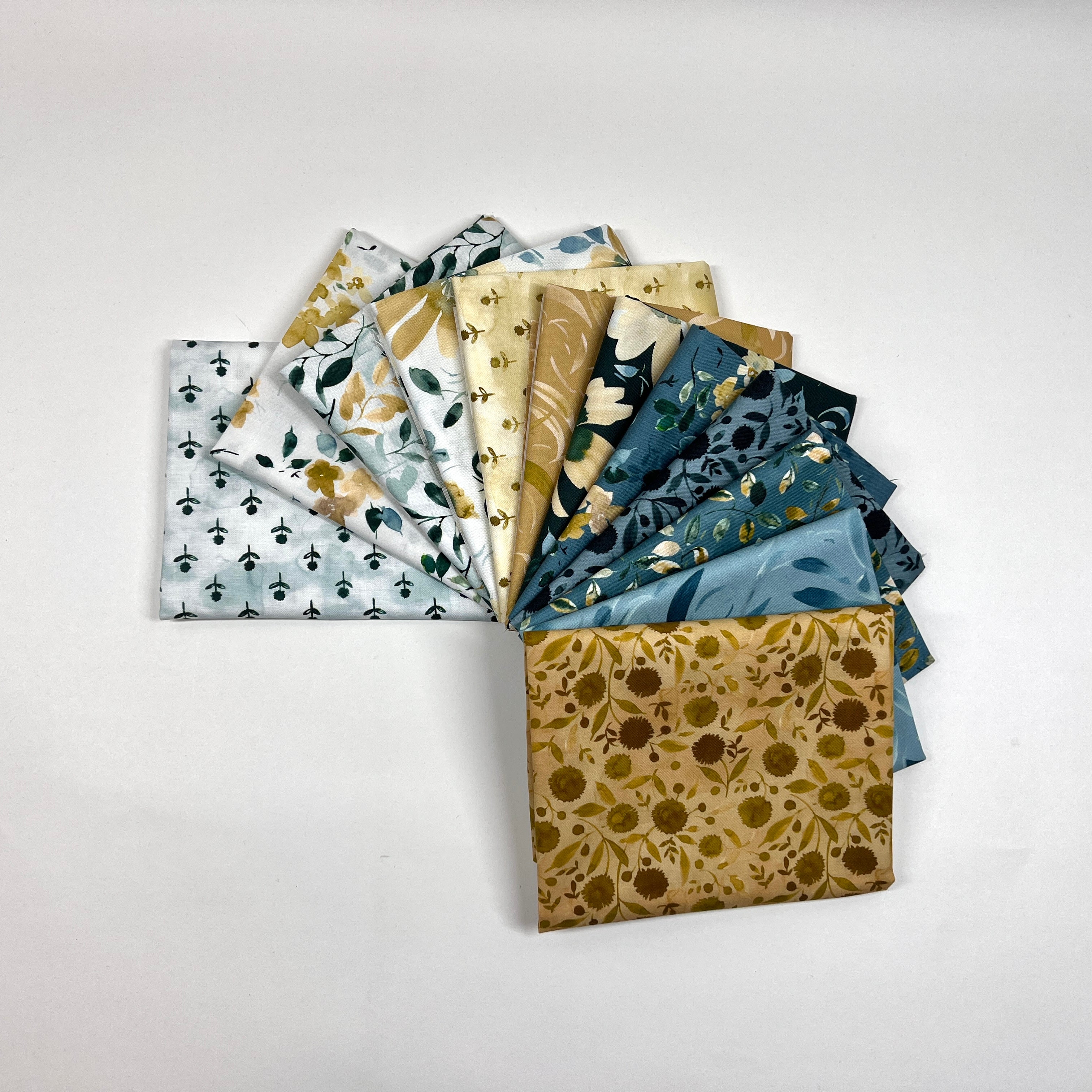 Bring warmth, elegance, and a touch of nature into your next project with the Golden Hour collection by Stephanie Ryan. This curated 12-piece fat quarter bundle features a beautiful balance of soft florals, leafy prints, and subtle textures in a harmonious palette of golden honey, deep teal, soft blue, ivory, and forest green.