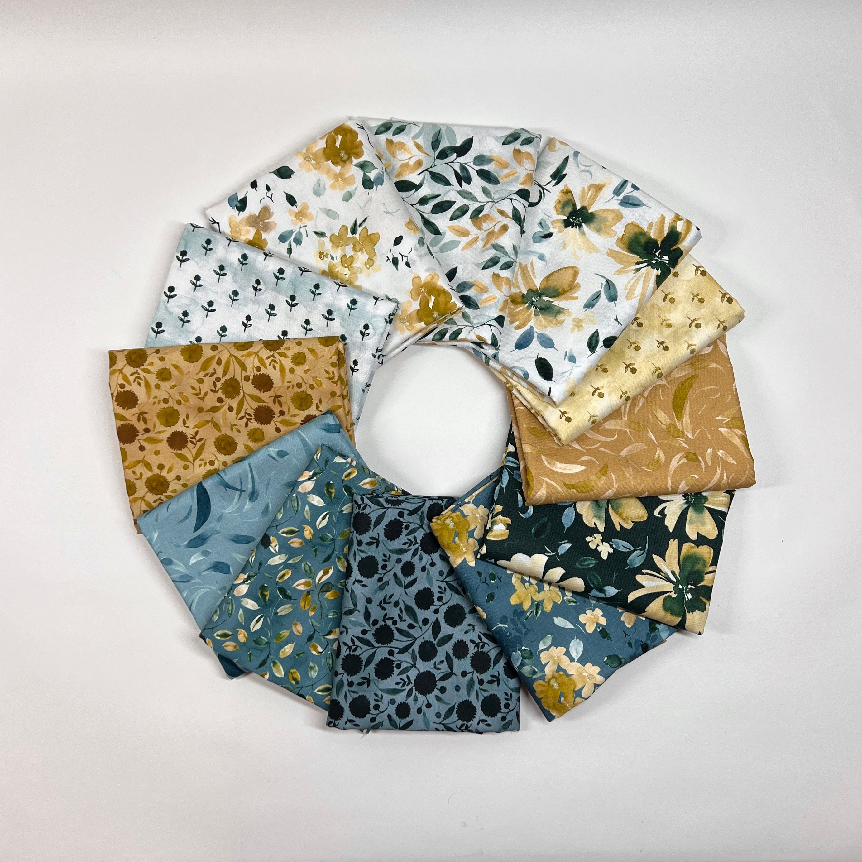 Bring warmth, elegance, and a touch of nature into your next project with the Golden Hour collection by Stephanie Ryan. This curated 12-piece half-yard bundle features a beautiful balance of soft florals, leafy prints, and subtle textures in a harmonious palette of golden honey, deep teal, soft blue, ivory, and forest green.