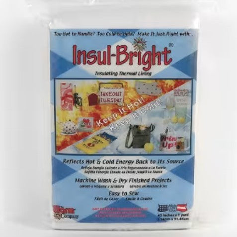 Insul-Bright is a needle-punched, insulated material ideal for crafters. With today's focus shifting back to family and home, new and experienced sewers are choosing simple, practical projects for use in their homes and as gifts. Pot holders, oven mitts and casserole covers are all ideal projects made functional and safe with Insul-Bright. It consists of polyester fibers, needle-punched through a reflective metalized polyester film. The needled material is breathable and won't break down with washing. The polyester fibers resist conduction while the reflective metalized polyester film reflects radiant energy, hot or cold, back to its source.
