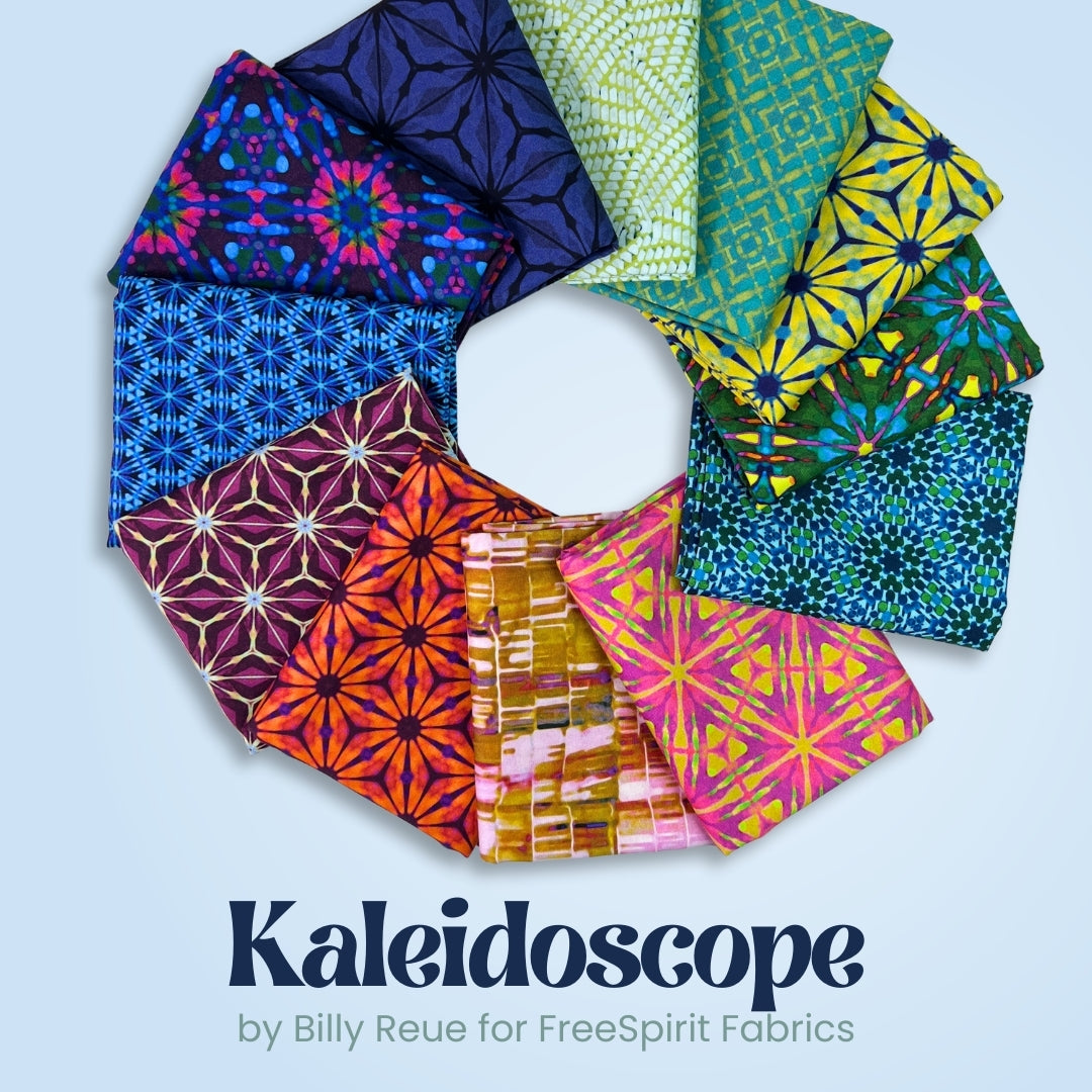Bring a burst of bold color and geometric energy to your next project with the Kaleidoscope collection by Billy Reue for FreeSpirit Fabrics. This 12-piece half yard bundle features vibrant, high-contrast prints inspired by the symmetry and movement of kaleidoscopic patterns.