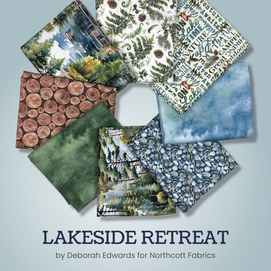 Escape to the peaceful beauty of the great outdoors with Lakeside Retreat by Deborah Edwards for Northcott Fabrics. This 8-piece half yard bundle captures the calm and quiet of a woodland getaway, where pine trees meet still waters and nature sets the pace.