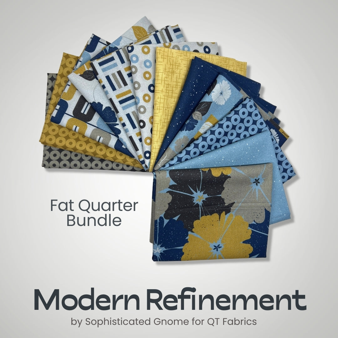 Bring a touch of contemporary elegance to your next quilt with the Modern Refinement collection by Sophisticated Gnome for QT Fabrics. This beautifully coordinated 12-piece fat quarter bundle features a stylish mix of geometric patterns, modern florals, and textured prints in a sophisticated palette of navy, denim blue, soft gray, and warm mustard.
