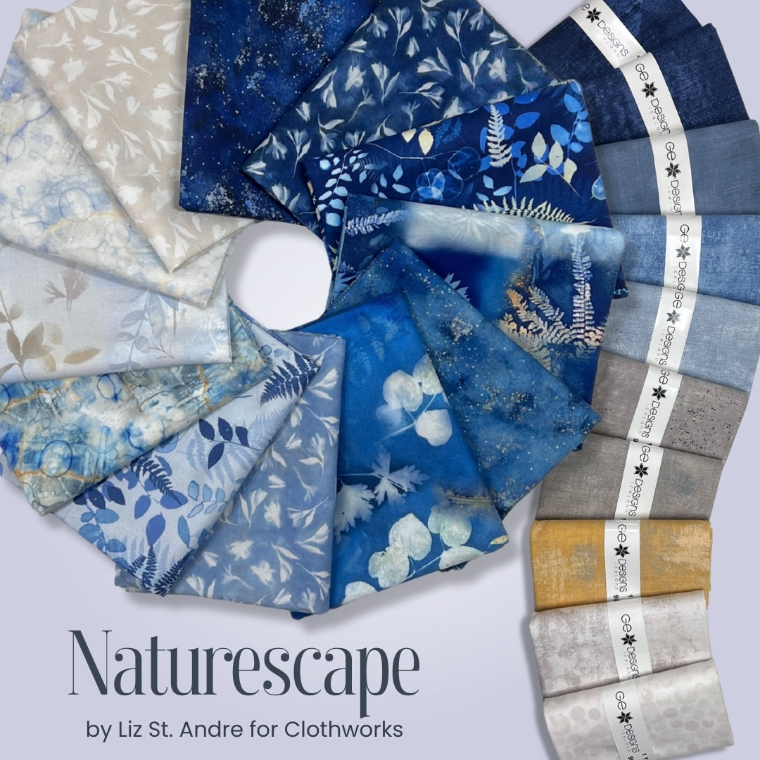 Bring the calm beauty of the natural world into your next quilt with Naturescape, a stunning fabric collection designed by Liz St. André for Clothworks. This 12-piece half yard bundle features a soothing palette of blues, soft neutrals, and organic motifs inspired by leaves, branches, textures, and quiet landscapes.