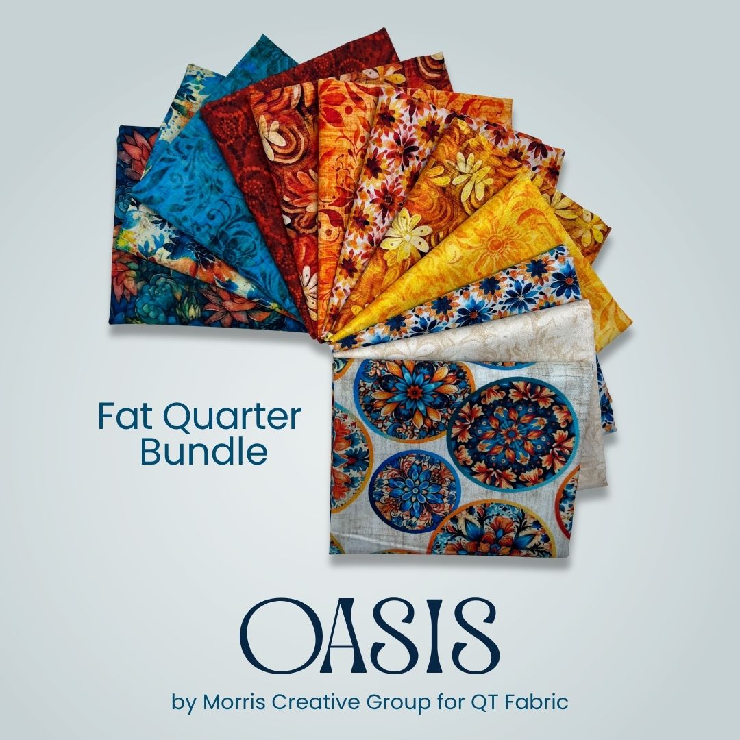 Breathe life and vibrancy into your quilting with the Oasis Collection by Morris Creative Group for QT Fabrics. This 12-piece fat quarter bundle bursts with bold floral designs, sun-drenched textures, and rich jewel tones that bring the warmth of summer gardens and the serenity of a desert bloom to your sewing table.