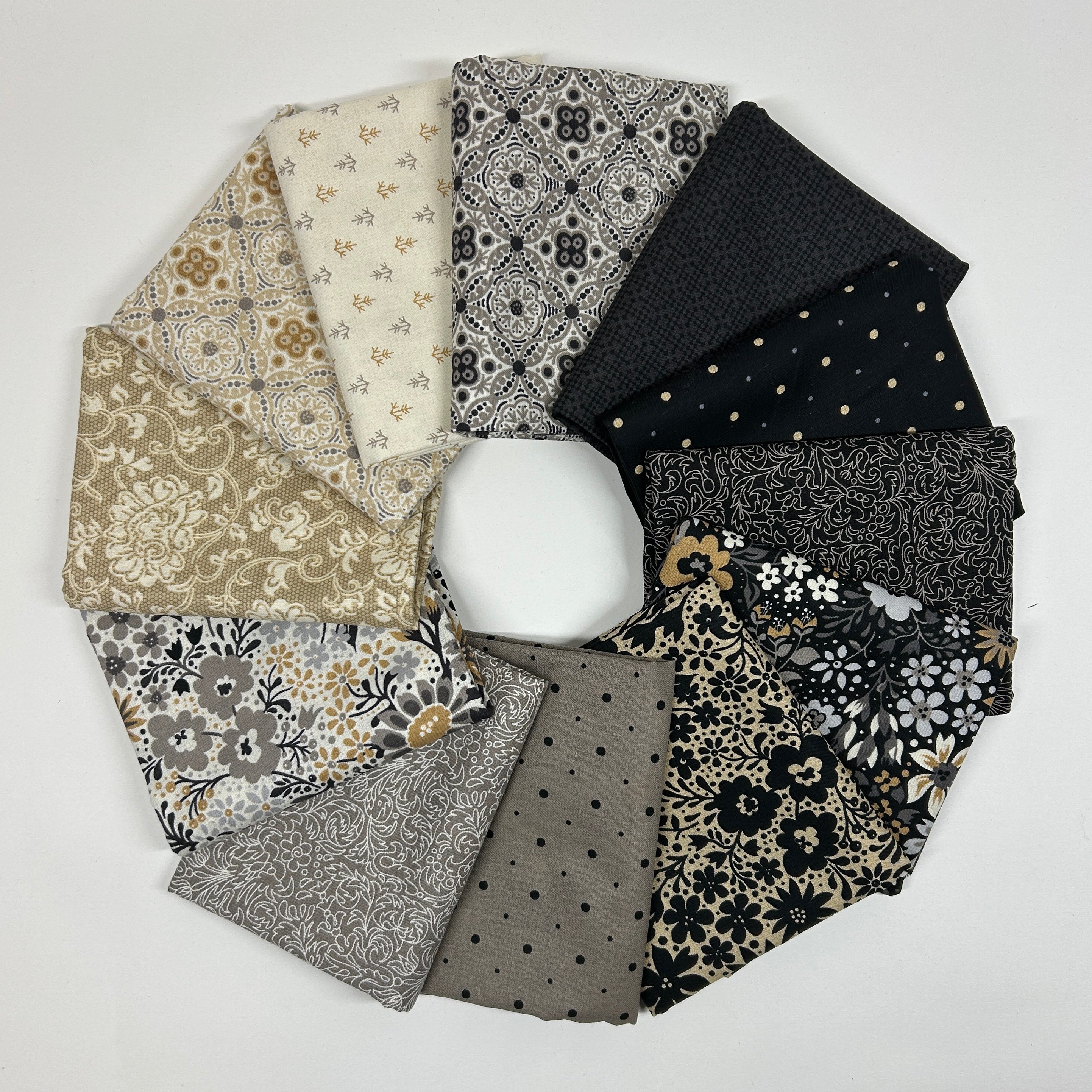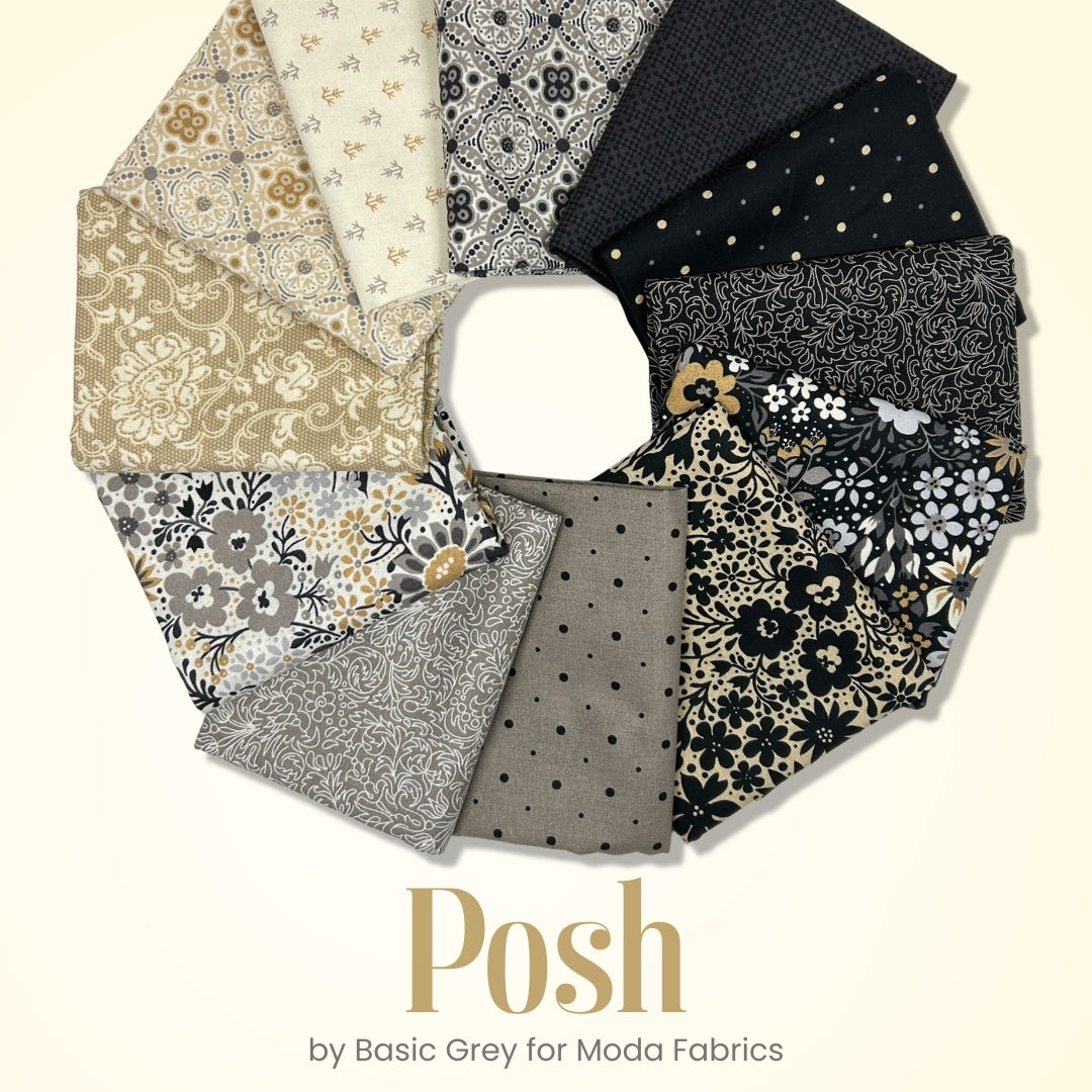 Elegant neutrals meet timeless sophistication in Posh by BasicGrey for Moda Fabrics. This beautifully curated 12-piece half yard bundle blends soft greys, warm creams, inky blacks, and touches of muted gold for a palette that feels both classic and refined.