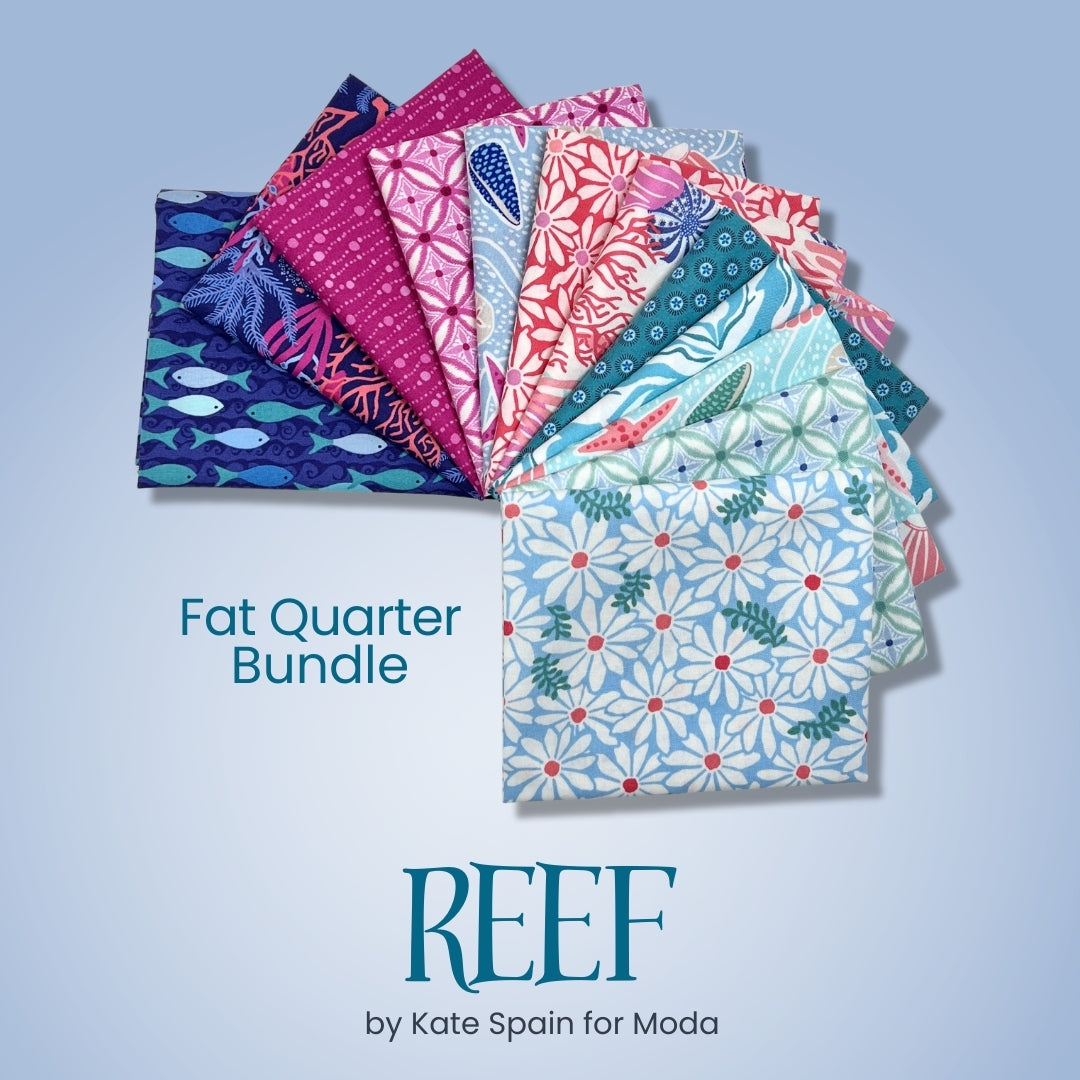 Bring the beauty of the ocean to your next project with the 12 pc. Reef Fat Quarter Bundle by Kate Spain for Moda Fabrics. This stunning collection is inspired by vibrant coral reefs and coastal life, featuring playful sea creatures, flowing coral motifs, and fresh geometric prints in a lively palette of turquoise, aqua, navy, coral, pink, and soft white.