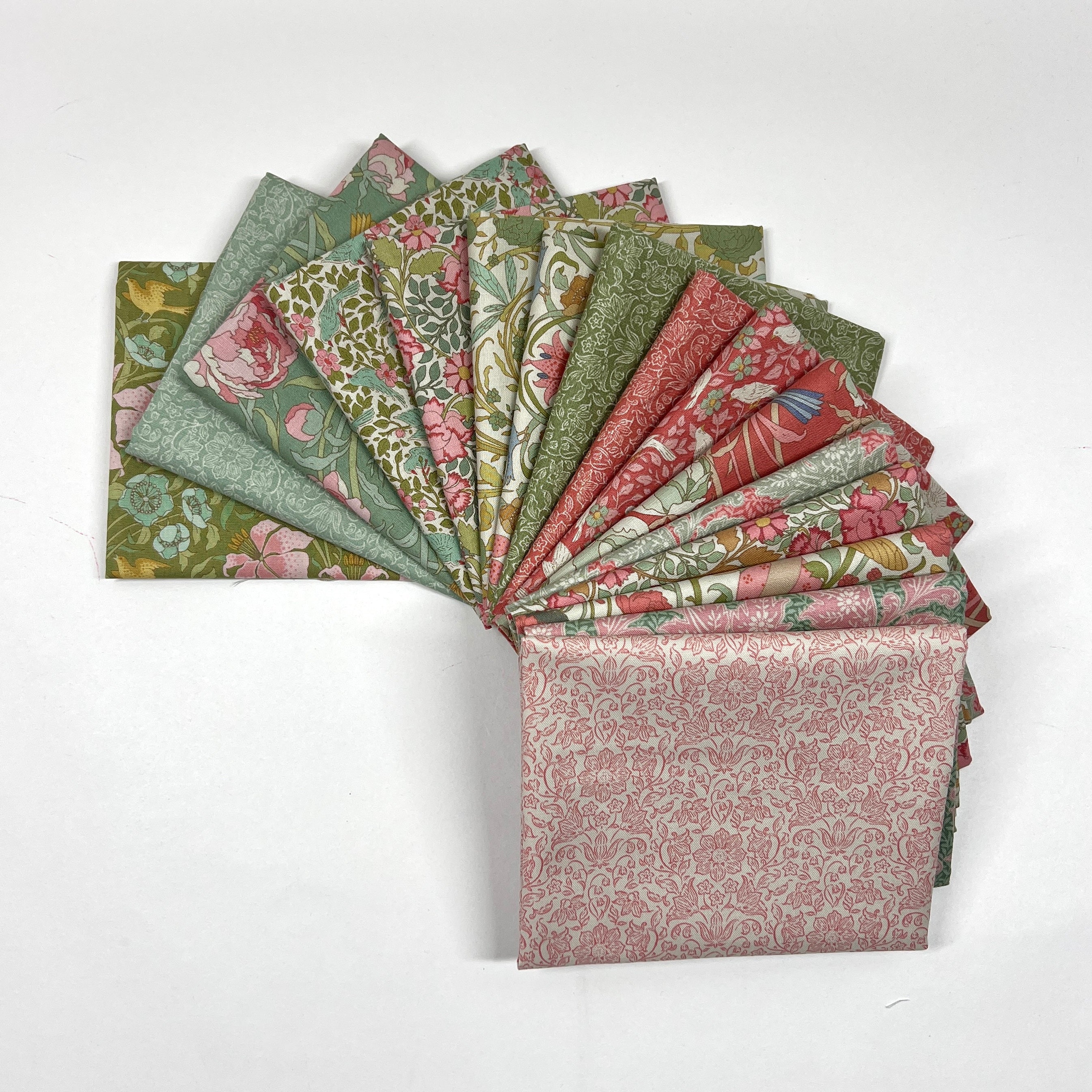 This beautiful 16-piece bundle features an elegant mix of floral vines, delicate birds, and timeless decorative prints in a fresh palette of soft corals, rosy pinks, leafy greens, and gentle vintage-inspired tones. Each fabric feels romantic and classic, perfect for creating quilts and projects with a warm, nostalgic touch.