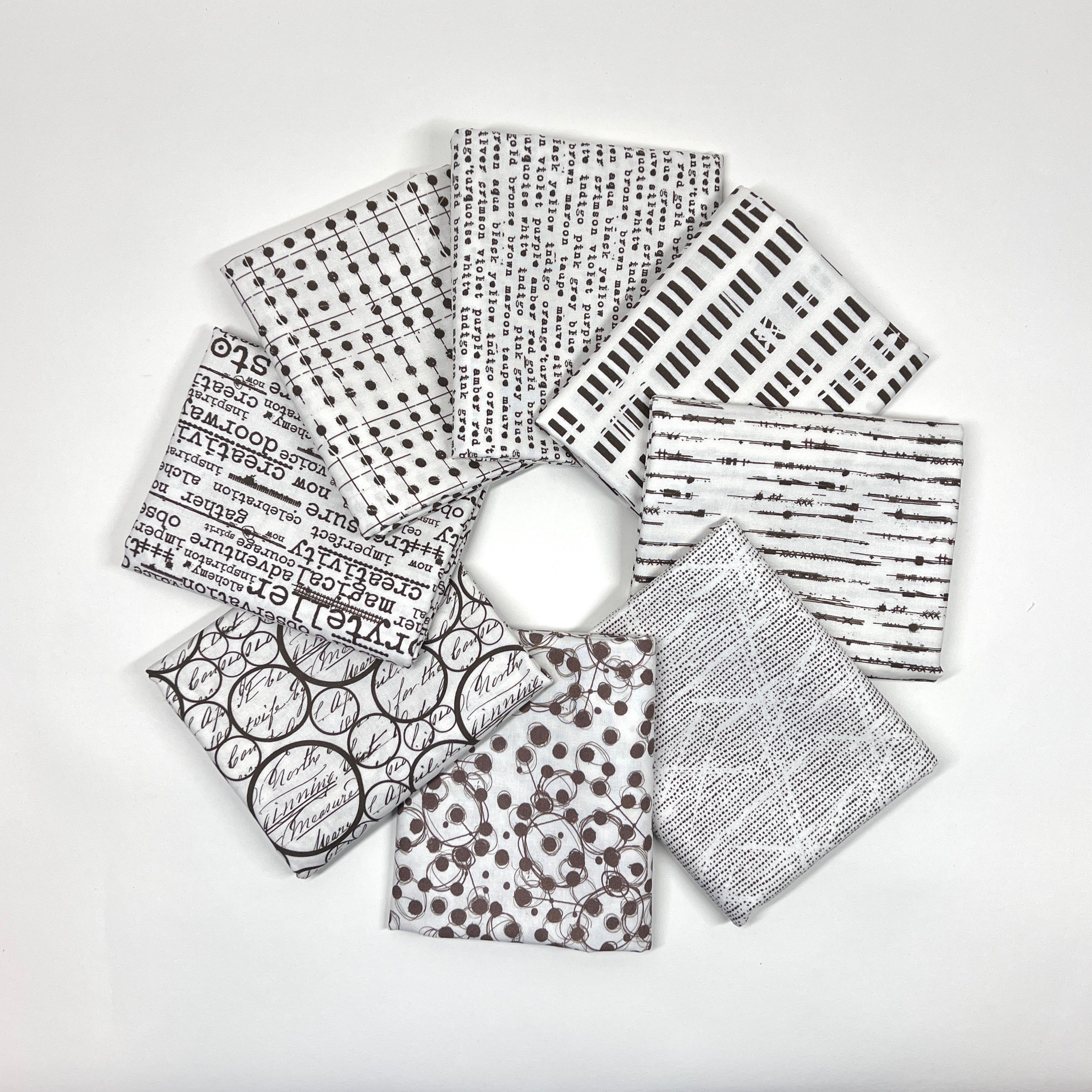 This striking 8-piece bundle features a dynamic mix of hand-drawn marks, layered text, graphic lines, and abstract patterns in a timeless black, white, and charcoal palette. Inspired by mixed media and urban texture, these prints are perfect for modern quilts, contemporary projects, and bold creative designs.