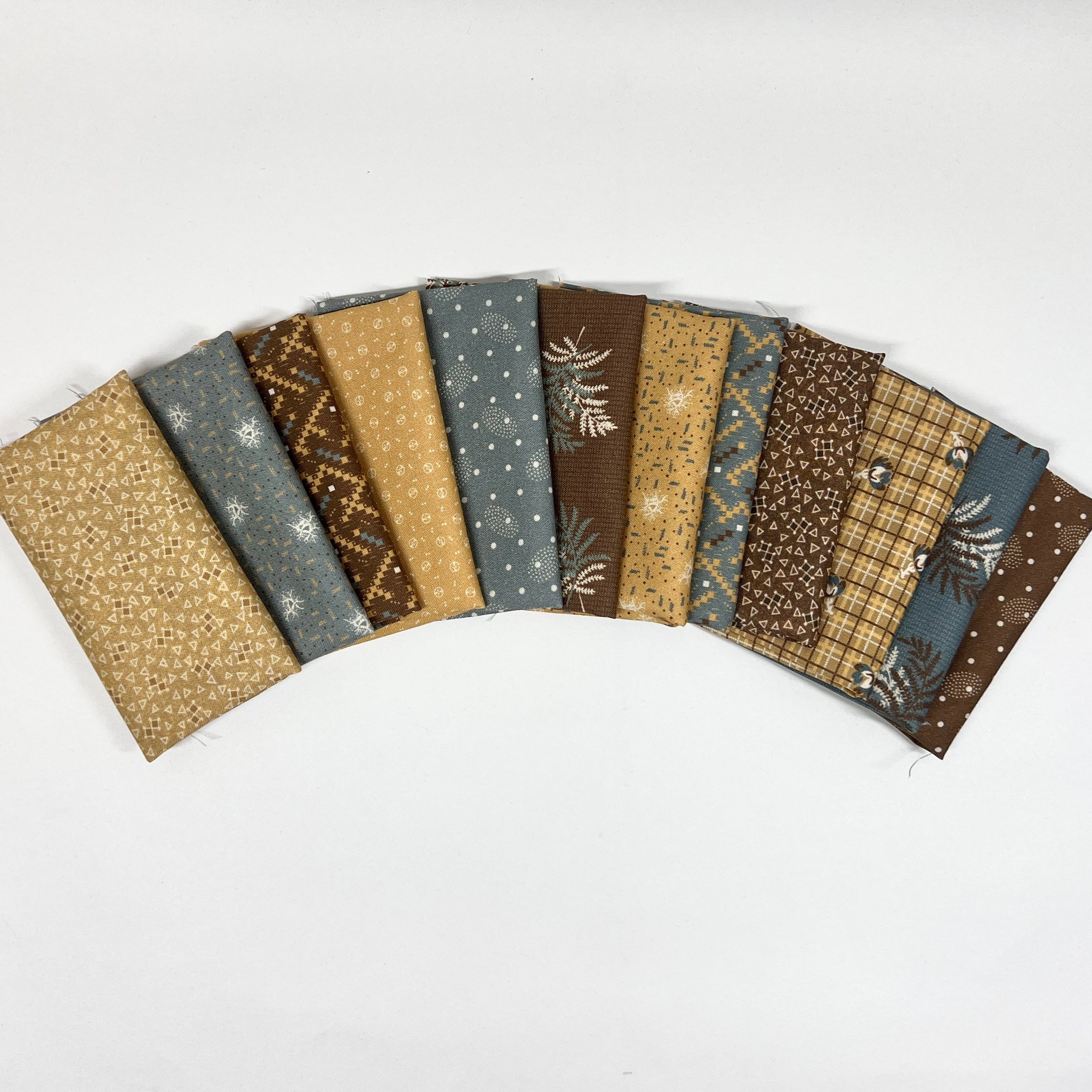 The Thimbleweed Lil' Bundle includes 12- 6"x21" cuts of fabric from the Thimbleweed collection by Julie Hendrickson for Windham Fabrics to create any GE Designs Lil' Table Runner. The lil bundle does not include fabric for 1/4 yard of binding.