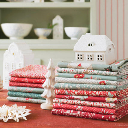 The collection features a delightful mix of winter florals, tiny prints, sweet holiday motifs, and playful seasonal illustrations, including bears, deer, and festive details. The fabrics are beautifully coordinated in classic Christmas reds, soft sage greens, creamy neutrals, and gentle pastel tones, creating a warm and storybook-inspired holiday look.