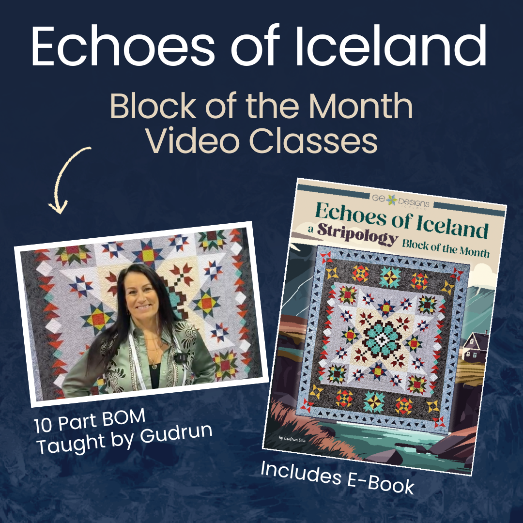 Explore the beautiful quilt inspired by the landscapes and motifs of Iceland. As you create each block, you’ll build your skills with the Stripology ruler. This collection includes the spiral-bound pattern book, fabric kit, your choice of two backing kits, and 10 monthly Block-of-the-Month Video Classes starting February 2026 taught by Gudrun, the designer.