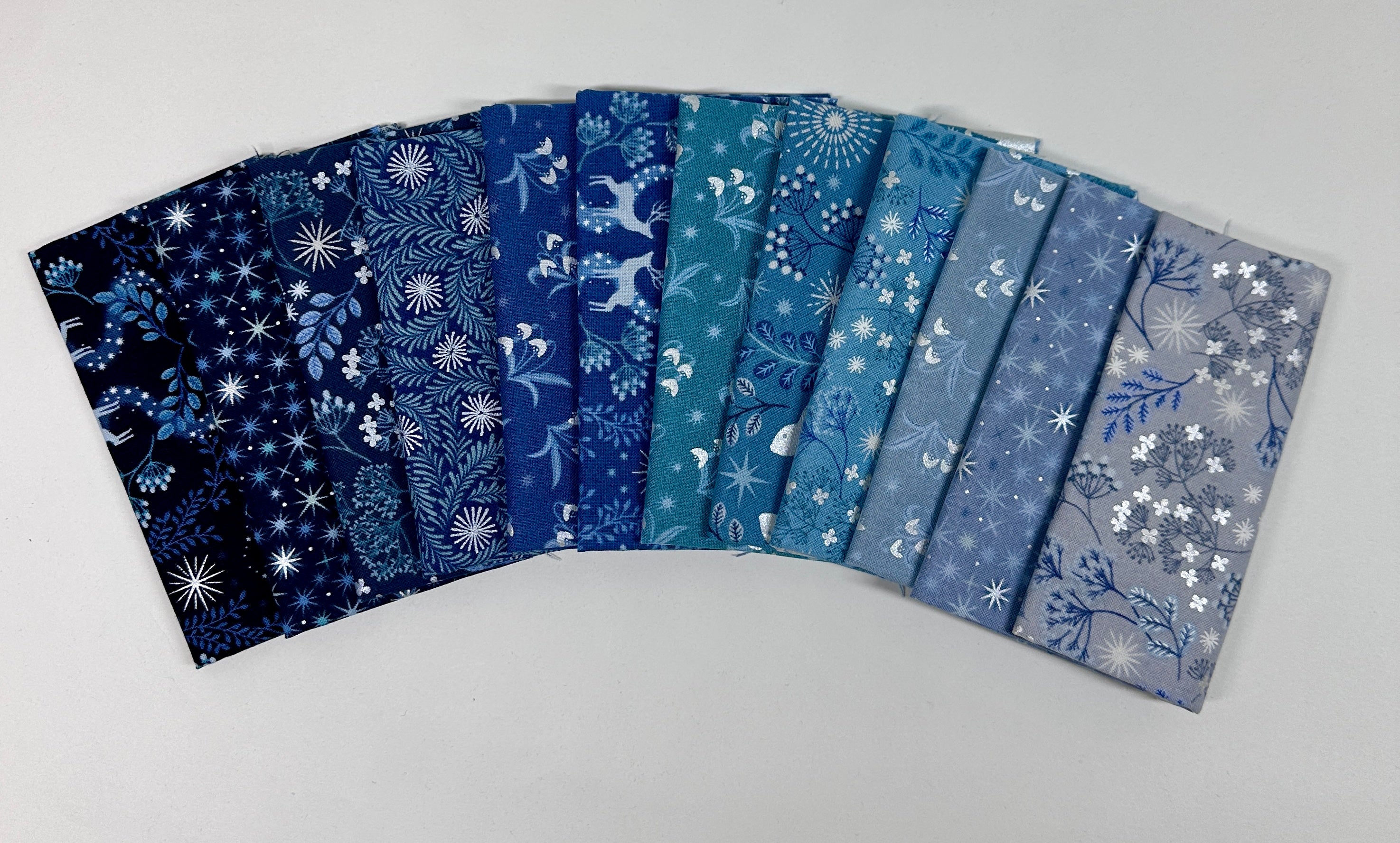 The A Winter's Moon Lil' Bundle includes 12- 6"x21" cuts of fabric from the A Winter's Moon collection by Lewis & Irene to create any GE Designs Lil' Table Runner. The lil bundle does not include fabric for 1/4 yard of binding.