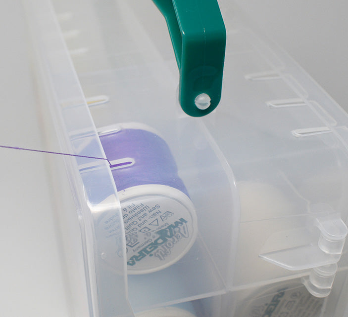 - This innovative storage case not only holds your thread spools but also features a built-in threading system that enables seamless thread delivery from the case directly to your machine, eliminating the need for unpacking.