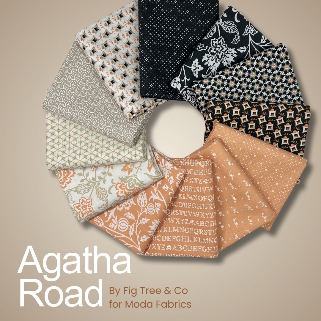 Step into timeless elegance with Agatha Road by Fig Tree & Co. for Moda Fabrics. This 12-piece half yard bundle blends vintage charm with modern flair, featuring delicate florals, classic motifs, and tiny geometrics in a cozy palette of butterscotch, soft caramel, ivory, and jet black.