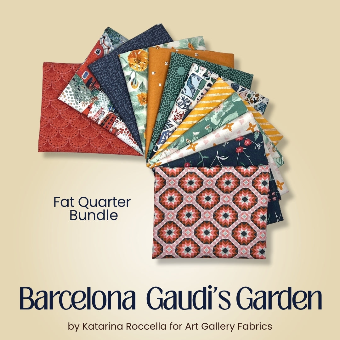 Experience the beauty and romance of Barcelona through this stunning collection by Katarina Roccella for Art Gallery Fabrics. Inspired by the city’s artistic soul, colorful architecture, and Mediterranean charm, this bundle combines rich hues, intricate patterns, and a modern-bohemian flair that captures the essence of Spanish style.