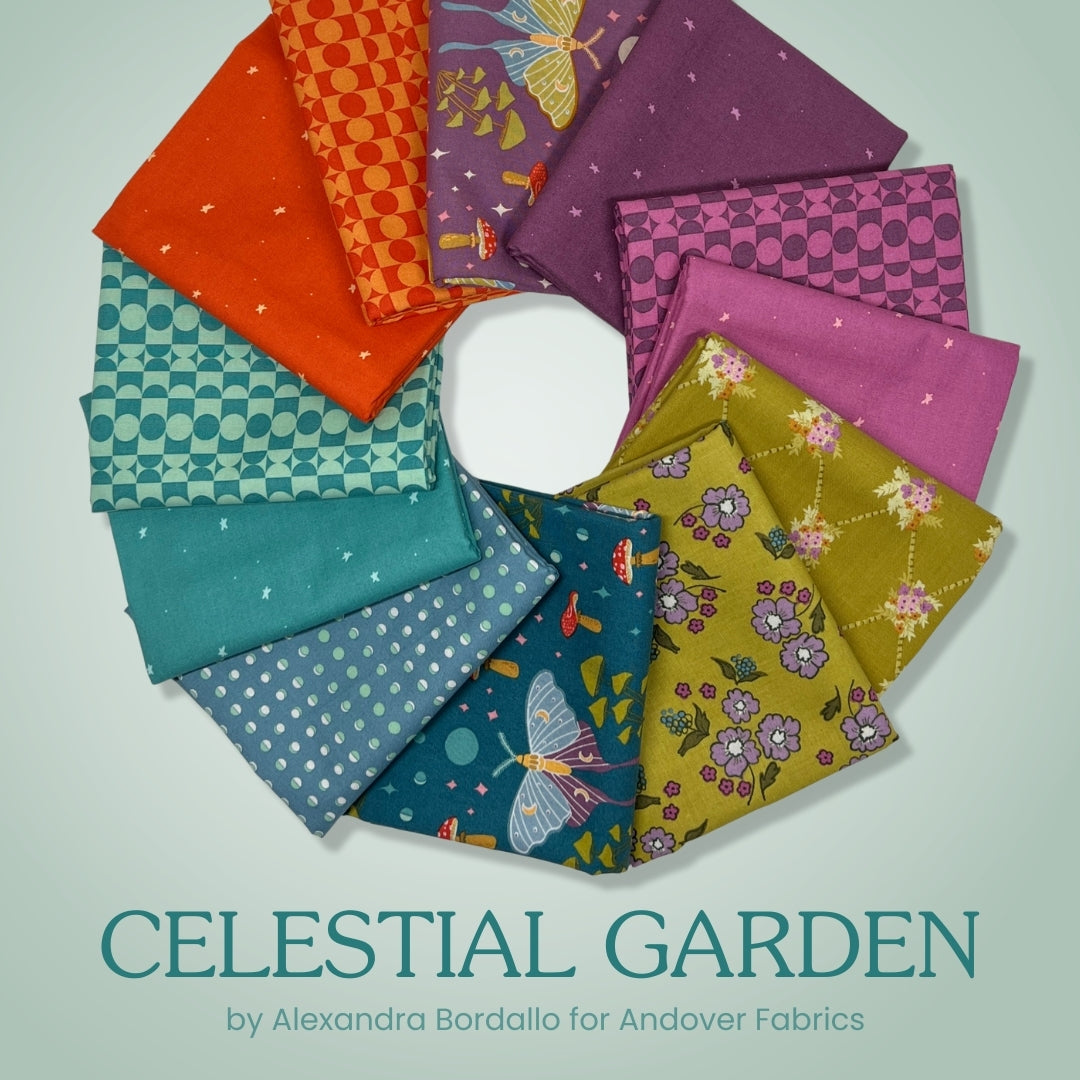 Step into a vibrant world of color and wonder with the Celestial Garden Half Yard Bundle by Alexandra Bordallo for Andover Fabrics.
