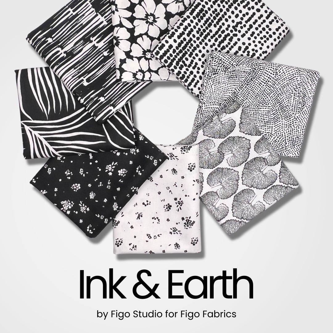 Bold, modern, and effortlessly versatile, the Ink and Earth collection by Figo Studio for Figo Fabrics is all about striking contrast and organic texture. This 8 piece half yard bundle features a crisp black-and-white palette filled with hand-drawn marks, painterly stripes, dotted textures, and nature-inspired motifs—perfect for adding graphic impact to any quilt.