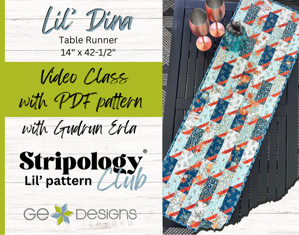 Join Gudrun in making the Lil' Dina Table Runner from the Stripology Lil' Patterns Club, with this instructional video class. Gudrun will teach you new tips, tricks, and techniques, help with cutting and staying organized as you sew. Gudrun will take you through all the steps of putting the table runner together, including cutting, sewing and quilting suggestions.