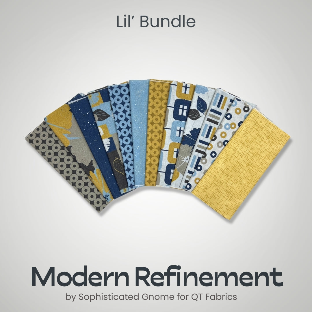 Modern Refinement Lil' Bundle includes 12- 6"x21" cuts of fabric from the Modern Refinement collection by Sophisticated Gnome for QT Fabrics to create any GE Designs Lil' Table Runner. The lil bundle does not include fabric for 1/4 yard of binding.