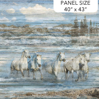 Capture the spirit of freedom and untamed beauty with the Running Free Horses panel from Deborah Edwards’ breathtaking Running Free collection for Northcott Fabrics. This stunning artwork features a powerful band of white horses charging through rolling waves beneath a vast, cloud-filled sky. Soft, painterly brushstrokes and a serene coastal palette of misty blues, sandy taupes, and weathered grays create incredible depth and movement.