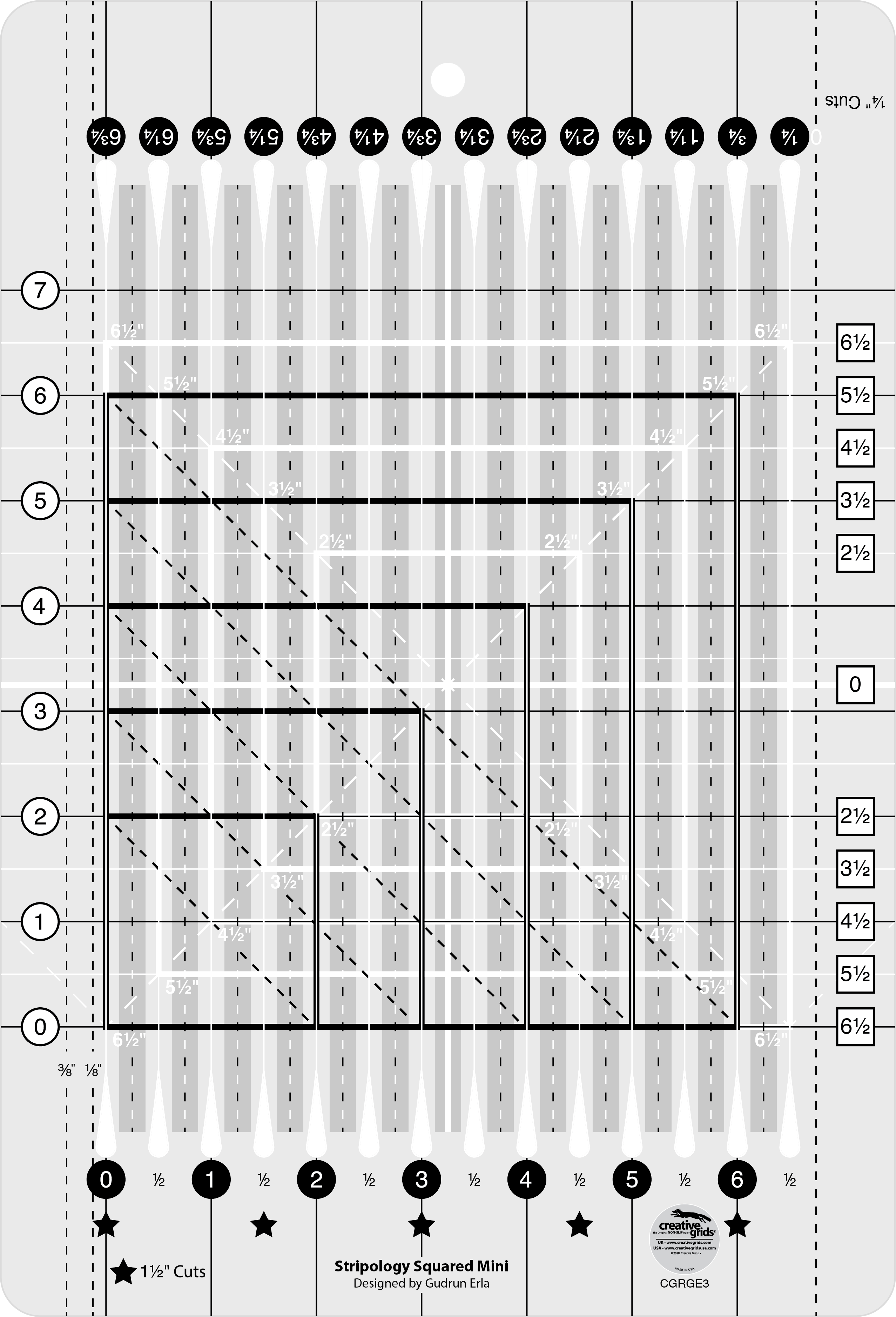 Stripology® Squared Mini ruler by GE Designs has all of the features of the original Stripology Squared ruler plus a few additional features you will love. It includes markings to square up half-square triangles, quarter-square triangles, and blocks up to 6 inch finished.