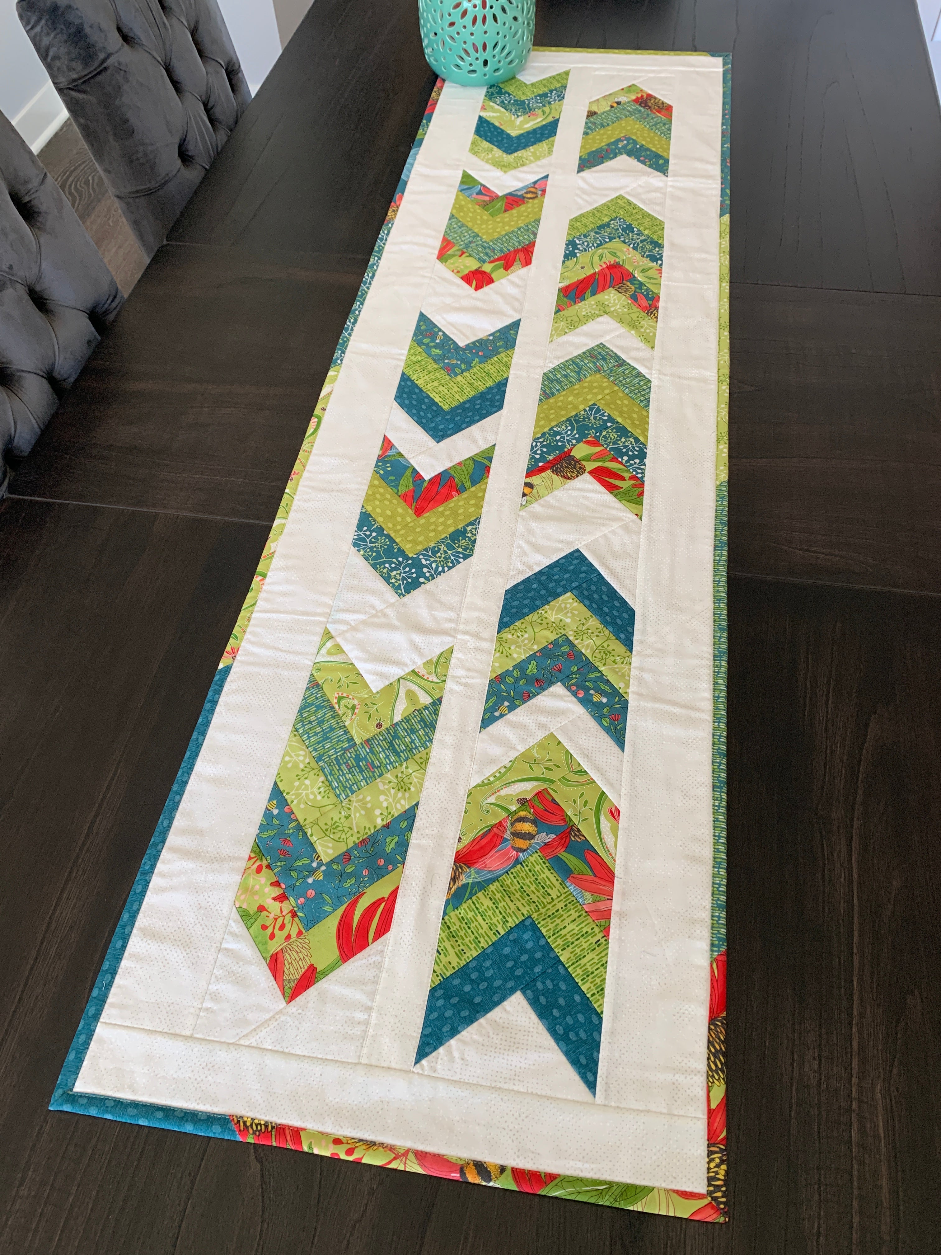This is a downloadable PDF pattern for the Tail Feather table runner 18" x 64" and a video class. The runner is done with a Quilt as you go method and Gudrun will take you through the whole process in the video class.