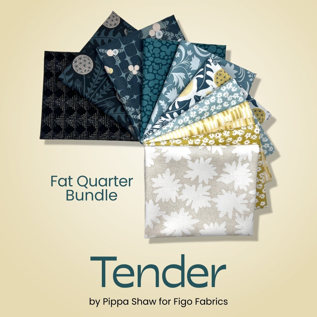Soft, serene, and beautifully balanced, Tender by Pippa Shaw for Figo Fabrics is a timeless collection inspired by quiet moments and organic beauty. This 10 piece fat quarter bundle features a soothing palette of teal, blue-grey, soft white, navy, and warm golden accents, paired with delicate florals, textured geometrics, and graceful botanical motifs.
