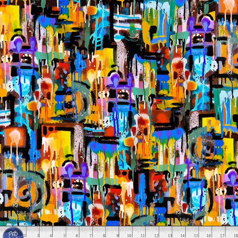 A continuous TWO yard cut of 108" wide Urban Ink Dark and Moody Graffiti by Alloyius McIlwaine for P&B Textiles.