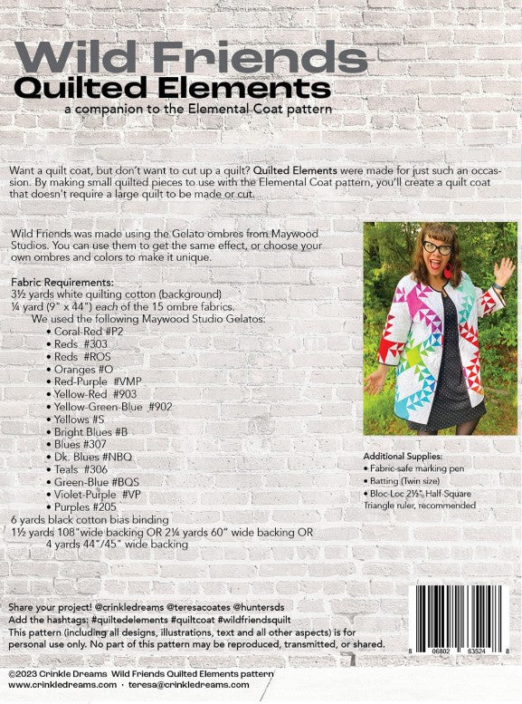 Wild Friends Quilted Elements creates small quilted sections, perfectly sized to coordinate with the Elemental Coat pattern, to create a quilt coat using the Wild Friends quilt design. Now you don't have to make the whole quilt, just the parts you need. Designed to work with ombre fabrics, the pattern can also be used with any quilting cottons.